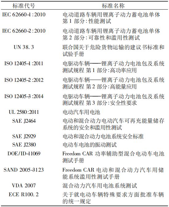 ISO在動力鋰離子電池方面制定的標準有ISO 12405-1∶2011《電驅動車輛———鋰離子動力電池包及系統測試規程 第1部分: 高功率應用》、ISO 12405-2∶2012《電驅動車輛——鋰離子動力電池包及系統測試規程第2部分: 高能量應用》及ISO 12405-3∶2014《電驅動車輛——鋰離子動力電池包及系統測試規程 第3部分: 安全性要求》,分別針對高功率型電池、高能量型電池以及安全性能要求,目的是為整車廠提供可選擇的測試項和測試方法。