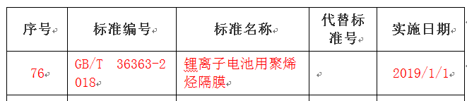 電池標準化技術委員會和中國化學與物理電源行業協會組織相關企業制定的《鋰離子電池用聚烯烴隔膜》國家標準(標準編號:GB/T 36363-2018),該標準將于2019年1月1日施行。